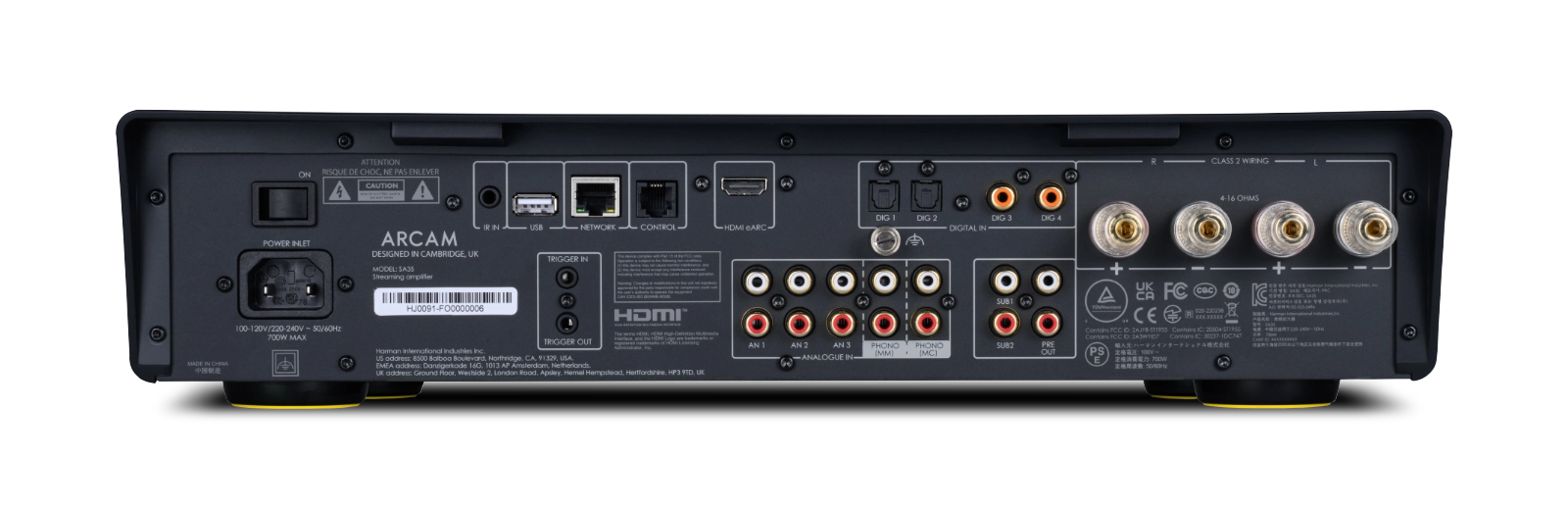 À l'avant, le SA35 est doté d'un nouvel écran haute résolution de 6,5 pouces (16,5cm) affichant pochettes d'albums et métadonnées de façon très lisible. La connexion du SA35 à votre réseau domestique via Wi-Fi est simple et rapide grâce à notre application ARCAM Radia. Une fois connecté, profitez d'une lecture instantanée en utilisant Apple Airplay, Chromecast, Spotify Connect, Tidal Connect et Roon.